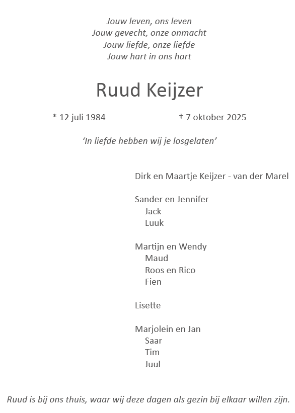 dinsdag 14 oktober 2025 om 14.00 uurAfscheidsdienst Ruud KeijzerVoorganger(s): ds. Lennart van Berkel Organist: Komfort en Joy Beamer: Paul Mosterd |