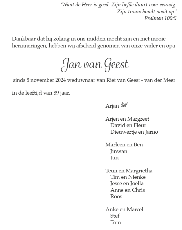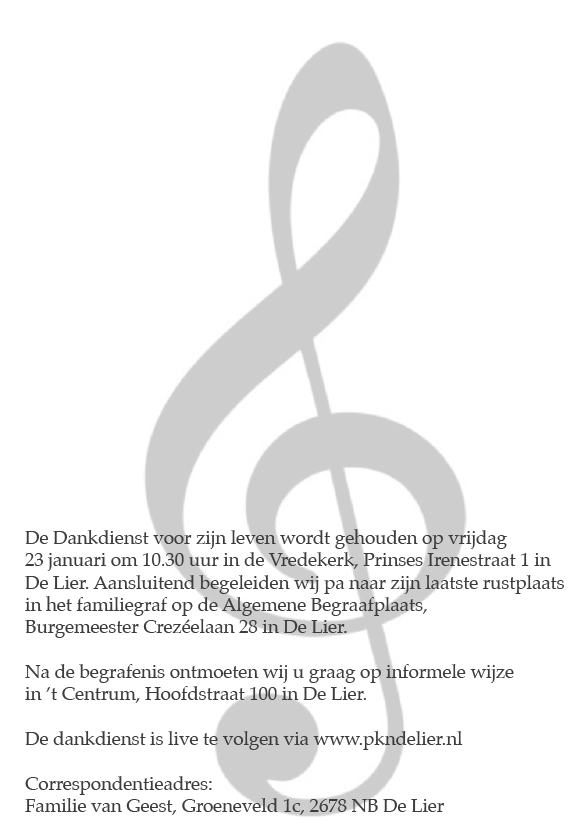 Vrijdag 23 januari 2026 om 10.30 uurDankdienst Jan van GeestVoorganger(s): ds. Lennart van Berkel Organist: Frank Baggerman Beamer: Ed Lijster |